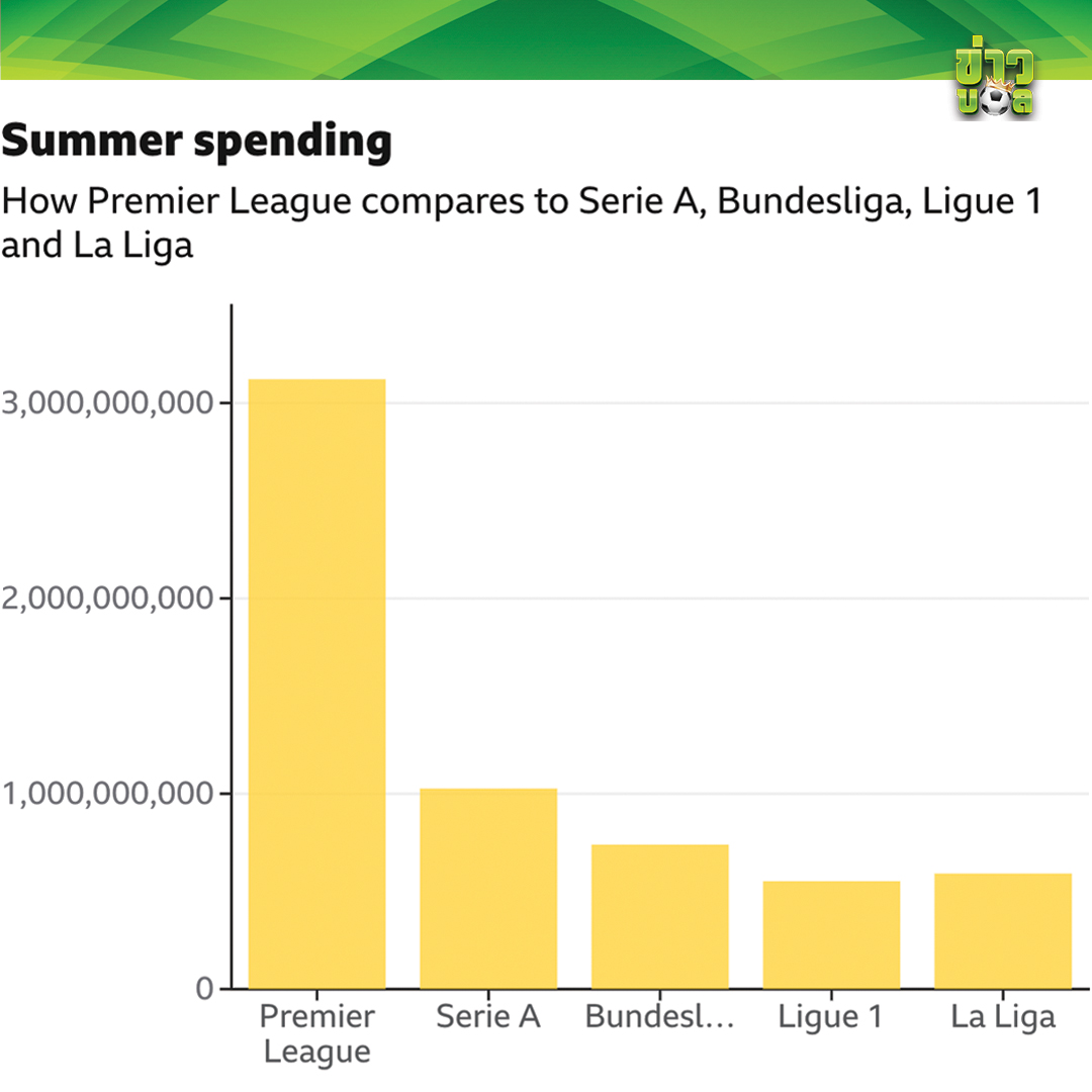 ยอดรวมในปีนี้ยังมากกว่ายอดรวมที่สโมสรในบุนเดสลีกา, ลาลีกา, ลีกเอิง และเซเรียอาใช้จ่ายรวมกันอีกด้วย
